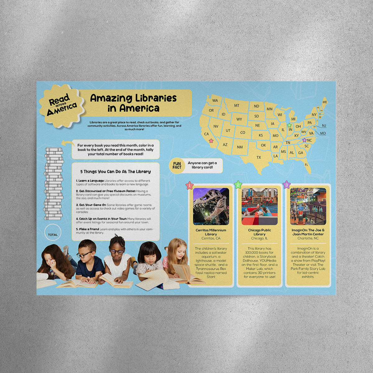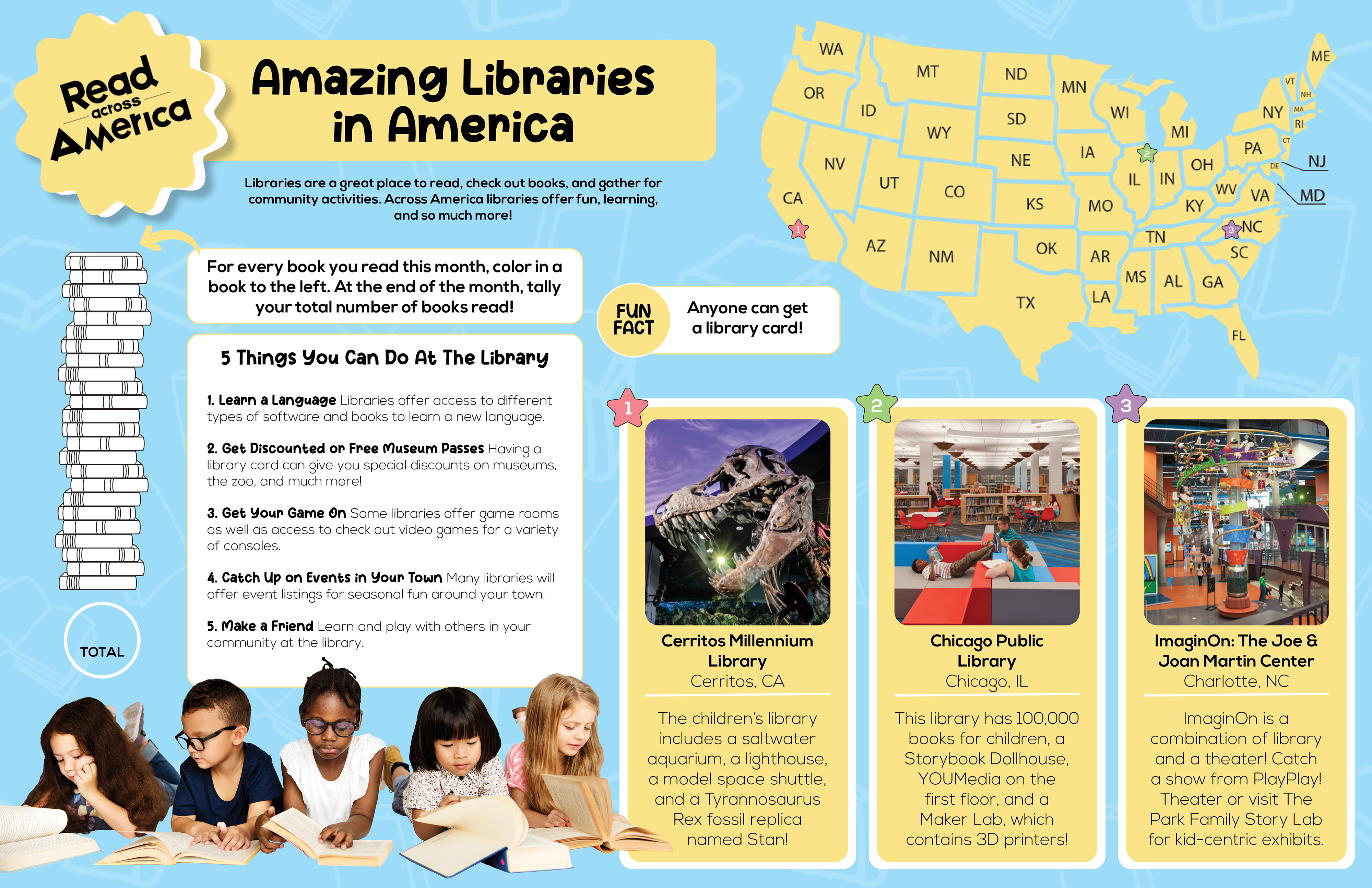 I designed and researched a worksheet highlighting some of the many amazing libraries across America geared towards children in the 1st, 2nd, and 3rd grade. This worksheet lets children track the books they read in a month, learn about different children’s libraries in the USA, and the powerful resources that may be provided in their local library.